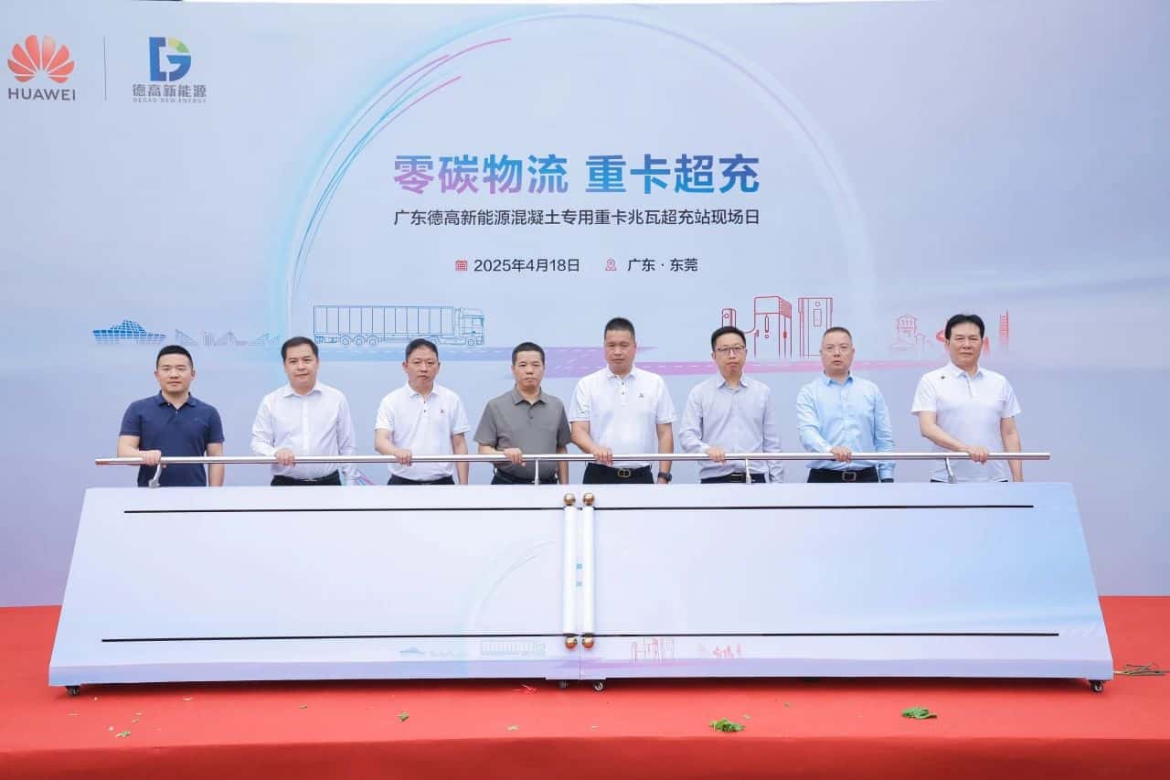 活動現(xiàn)場,氣氛熱烈非凡。東莞市德高新能源有限公司院內(nèi),整齊排列的解放底盤新能源充換電一體攪拌車,宛如整裝待發(fā)的鋼鐵軍團,氣勢恢宏。而一旁的華為數(shù)字能源重卡兆瓦超充站,散發(fā)著科技的魅力,與攪拌車相互輝映,勾勒出一幅智慧與力量交融的壯麗圖景。