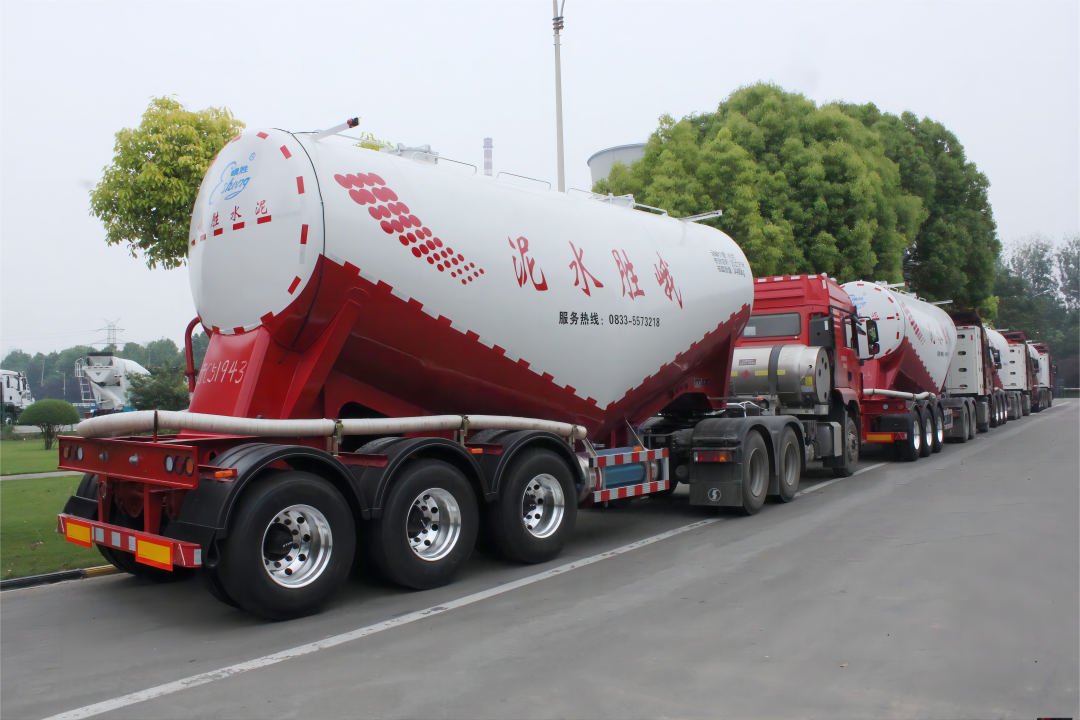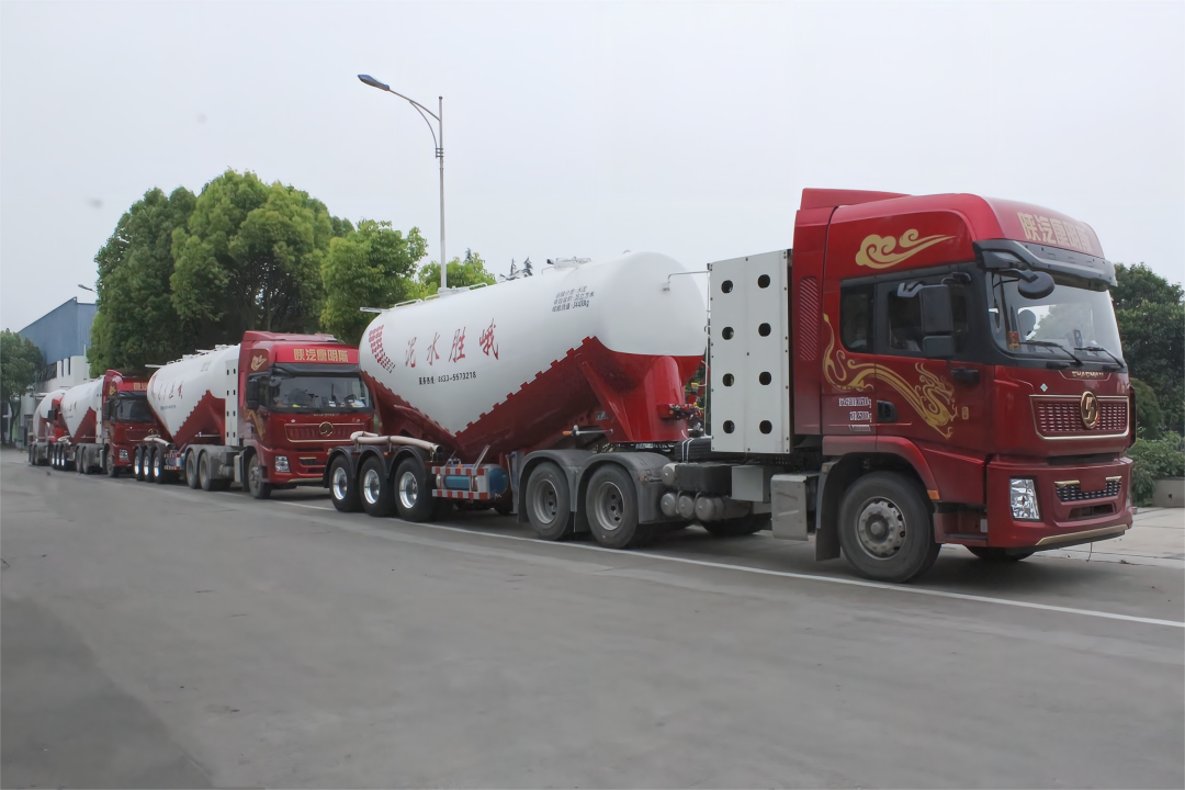 趁著涼爽的天氣,數臺凌宇粉罐半掛車整齊列陣,